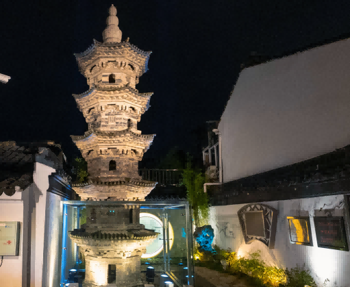 本项目用双层透明玻璃取代了栅栏,,,拉近了文物与市民的距离。。。。塔身周边还增设了十余个射灯,,,运用暖色灯光,,,在夜晚为古塔披上一件“灯影华裳”。。。。古塔后的小游园内用竹子、太湖石、墙画等全心装点,,,配合打造出一处市民家门口的小景观。。。。